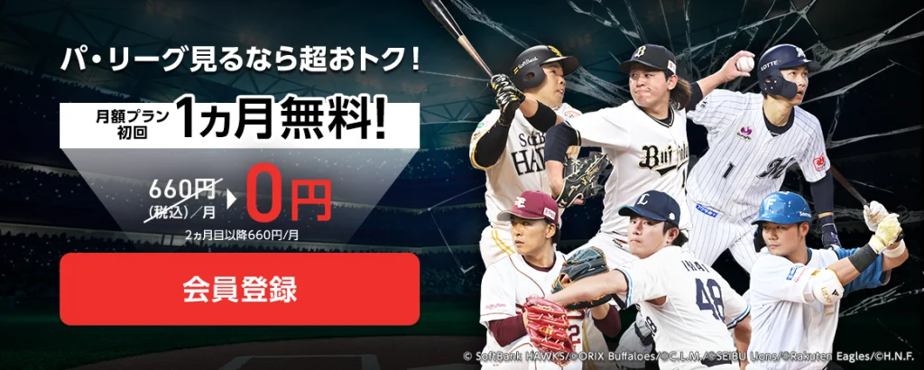 月額1,595円(税込)の有料プランに加入すれば、パ・リーグ全試合・交流戦・クライマックスシリーズ・オープン戦などを視聴可能です。