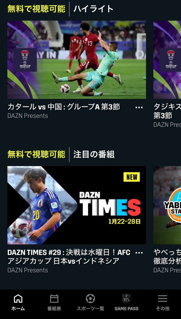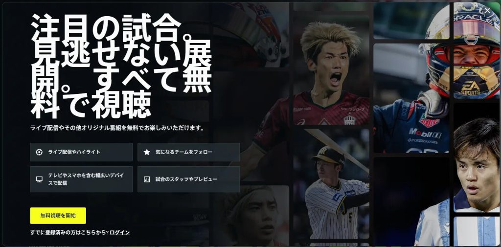 一部の試合やハイライト動画、スポーツニュースなどに限定されますが、登録するだけで追加料金なしで視聴が可能です。