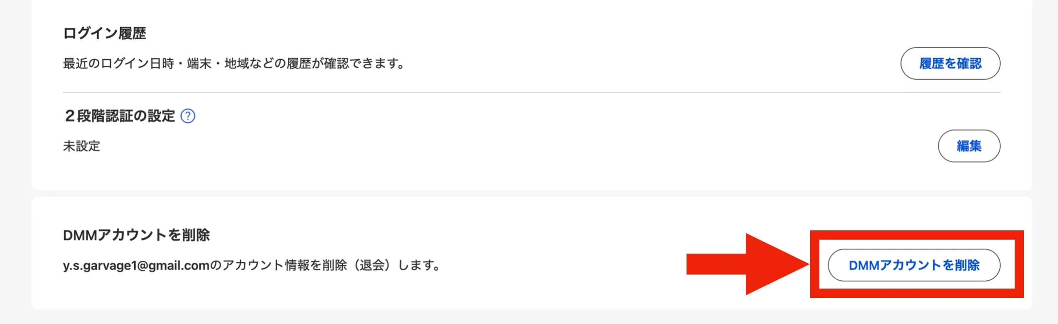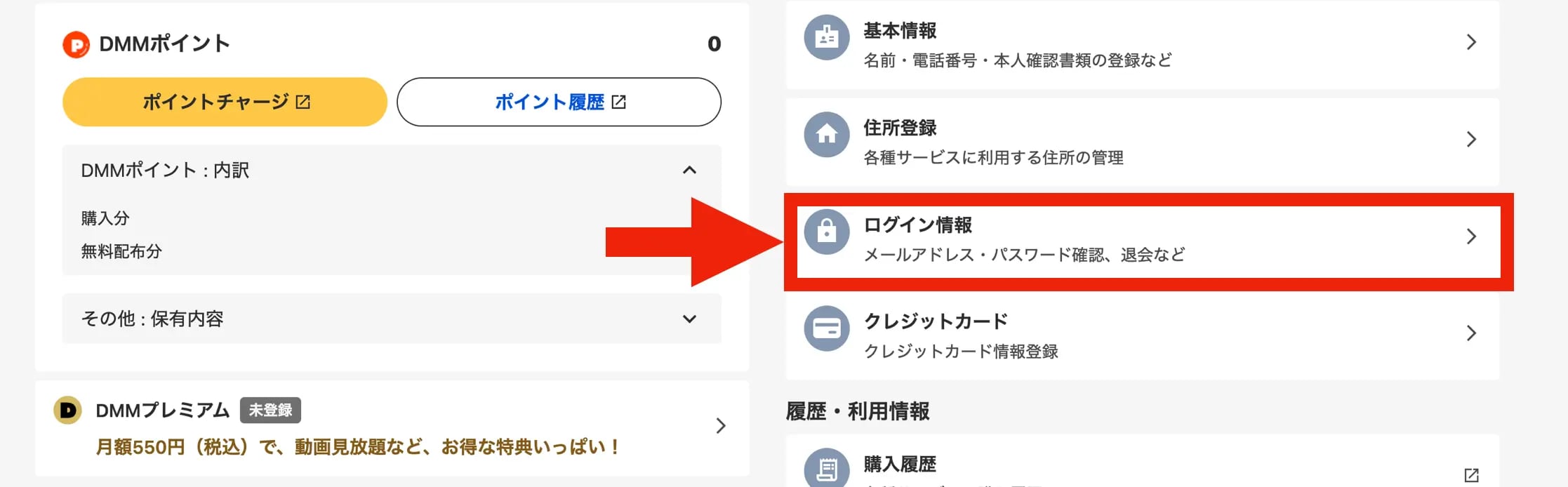 続いて「ログイン情報」を選択し、「DMMアカウントを削除」をクリックする。