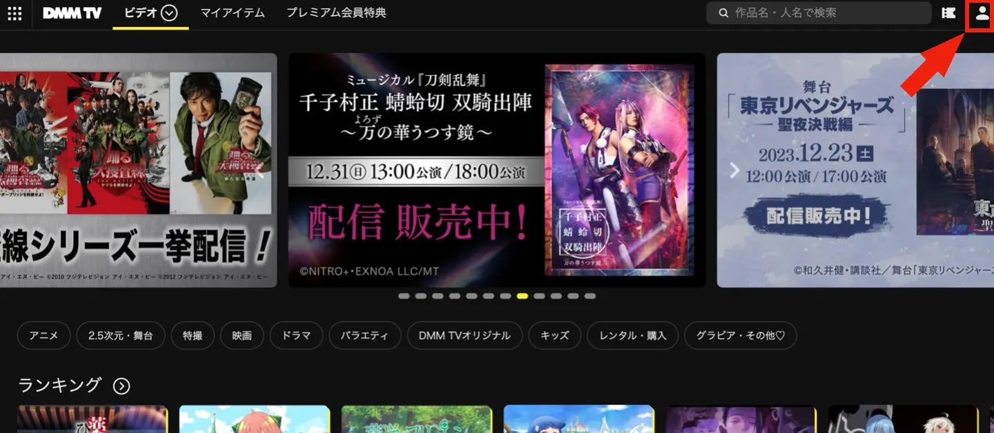 • DMM TVにログインして、右上にあるアイコンをクリックする