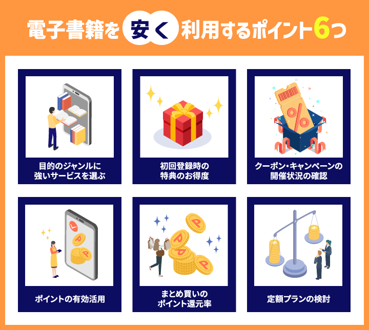 ここでは、電子書籍が安いサービスを利用する際の6つのポイントを解説しますので参考にしてください。