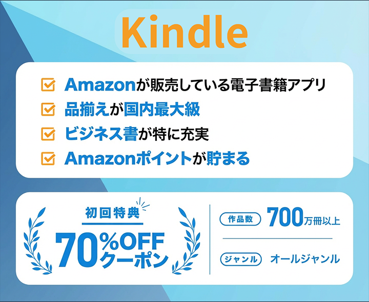 | 便利機能 | 目次、しおり、文字の大きさ調整、背景色の調整、フォント調整、コンテンツ内単語検索、行の間隔調整、ノート機能、ページの方向固定、辞書引き機能、読書の進捗把握機能、自動ページ送り、拡大表示 |