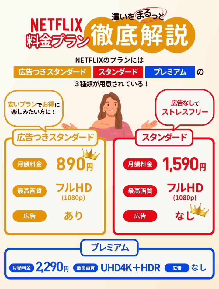 Netflixの料金プランは、月額890円の「広告つきスタンダードプラン」、月額1,590円の「スタンダードプラン」、月額2,290円の「プレミアムプラン」の3種類あります。