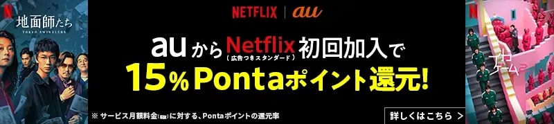 auからNetflix「広告つきスタンダードプラン」に申し込むと、毎月15%のPontaポイントが還元されるキャンペーンを実施しています。