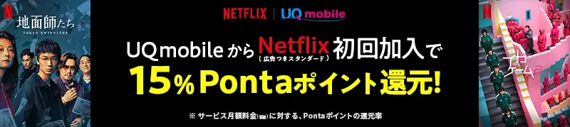 UQモバイルからNetflixの広告つきスタンダードプランを申し込むと15%Pontaポイント還元キャンペーンを実施しています。