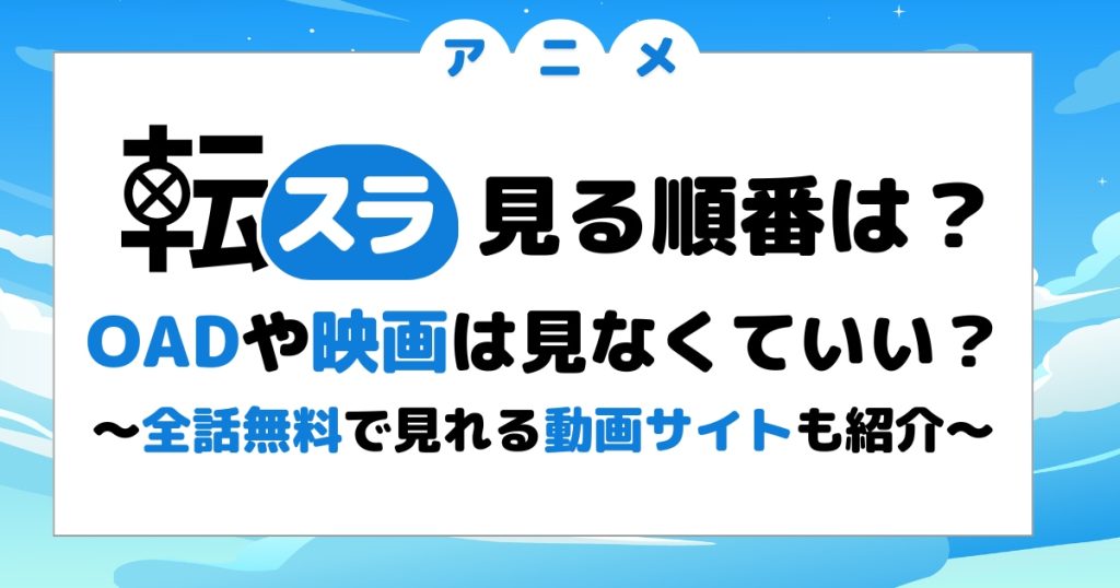 アニメ「転スラ」の見る順番は?OADや映画は見なくていい?全話無料で見れる動画サイトも紹介「転生したらスライムだった件(転スラ)」は2018年にアニメ化された小説作品であり、2021年に2期、2024年に3期、またOAD版やスピンオフ版の放送もしています。本記事では、アニメ『転スラ』の見る順番について、時系列や全話無料で見れる動画サイトなどもあわせて解説します。