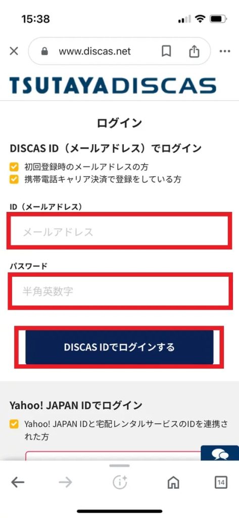 なお、「Yahoo!JAPAN ID」と「TSUTAYA DISCASのID」を連携させた方は、Yahoo!JAPAN IDからログインすることができます。下記のボタンをタップして、ログインフォームが開いたらIDを入力しましょう。