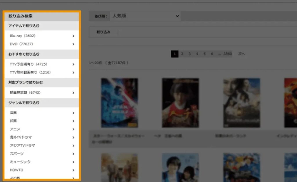 絞り込み検索を利用すると、より細かく絞り込んで作品を見つけ出すことができます。キャストや評価点、制作年など