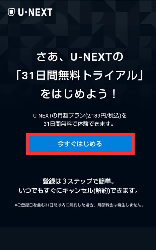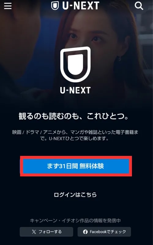 - WebブラウザよりU-NEXT公式サイトにアクセスし、「まずは31日間無料」をタップ