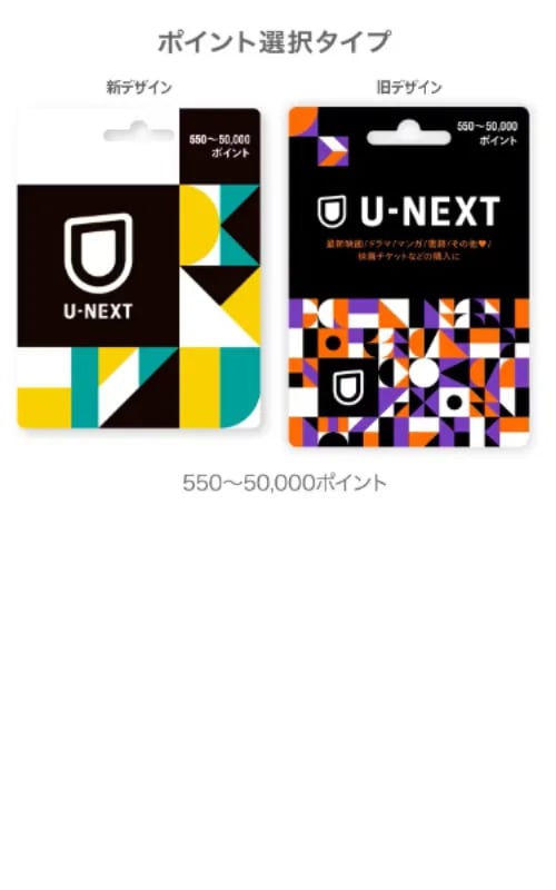 | U-NEXTカード・ギフトコード | ※Amazon、ヤマダビデオのアカウント登録者は利用不可 | オンラインショップ・店頭にて販売 | ・無料トライアル対象外 ・「見放題タイプ」「ポイント選択タイプ」から選択 | 「ポイント選択タイプ」は都度課金作品の利用のみ |