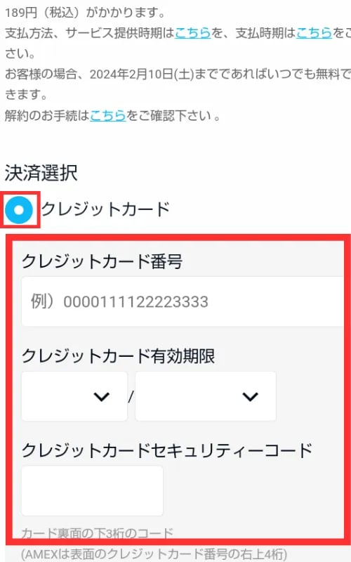 まず、クレジットカード払いの場合、登録時の操作が非常にシンプルです。