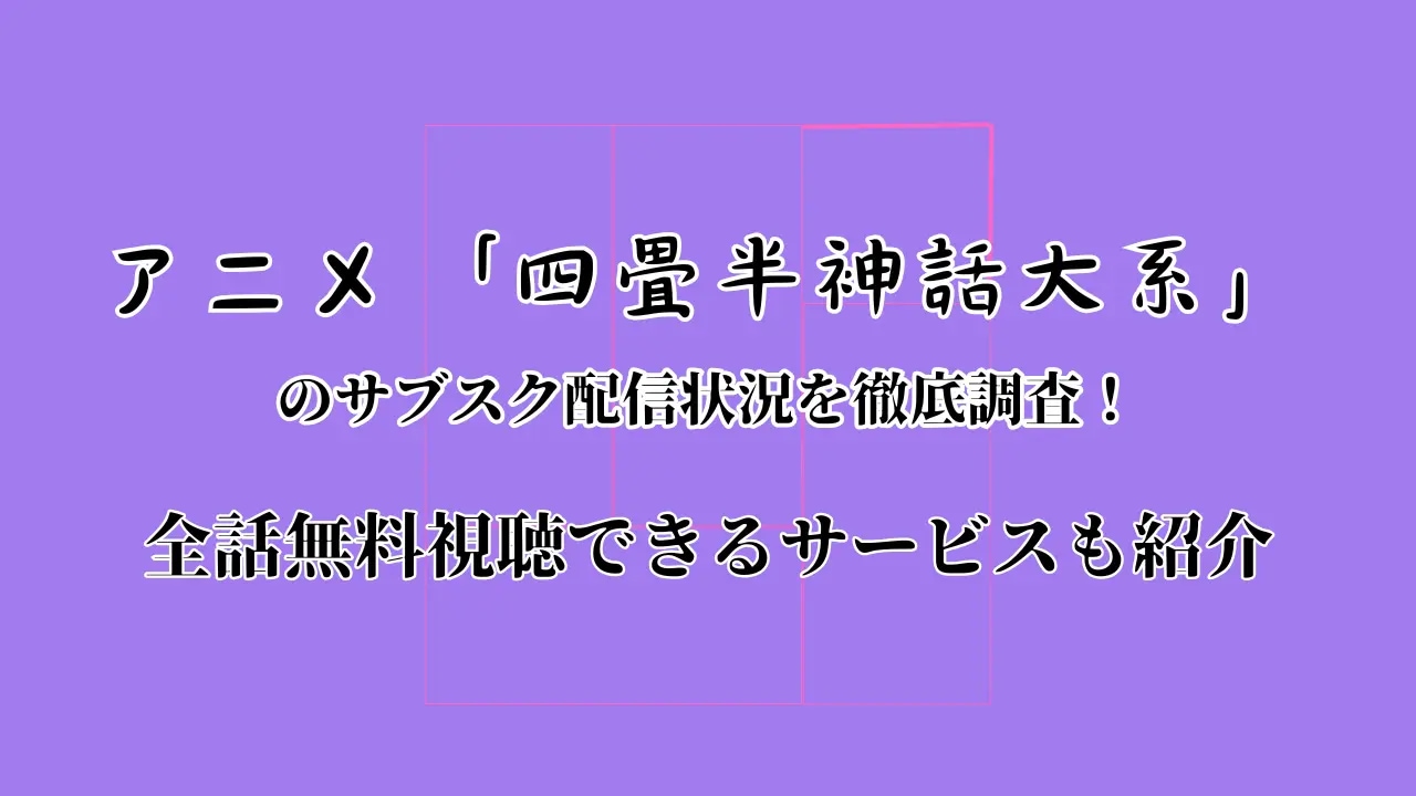 本記事では、アニメ「四畳半神話大系」のサブスク配信状況、全話視聴できるサブスクの詳細、口コミ評判、あらすじなどの作品情報、再放送予定などを調査した結果をまとめています。